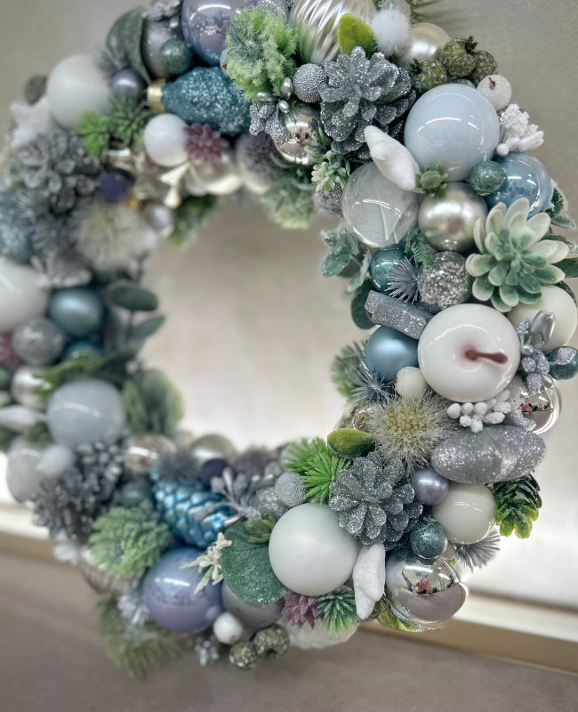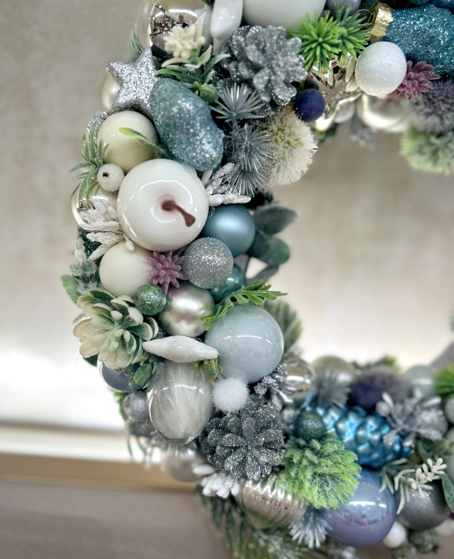 Laissez-vous séduire par la douceur hivernale de “Blue Harmony”, une couronne élégante aux nuances de bleu glacier, vert sapin et argent. Cette couronne évoque la magie d’un paysage enneigé et apporte une atmosphère chaleureuse et apaisante à votre intérieur.