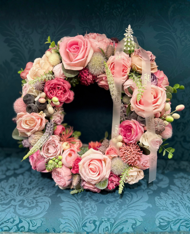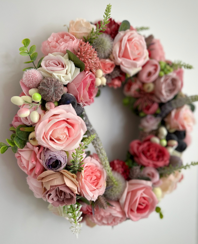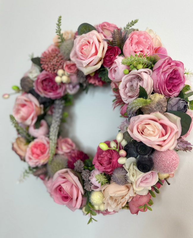 Chaque fleur de la couronne “Élégance Rosée” a été minutieusement sélectionnée et agencée à la main pour créer une harmonie parfaite entre textures et couleurs.