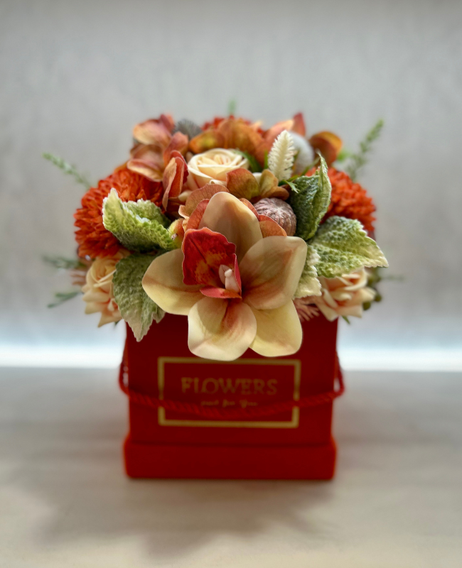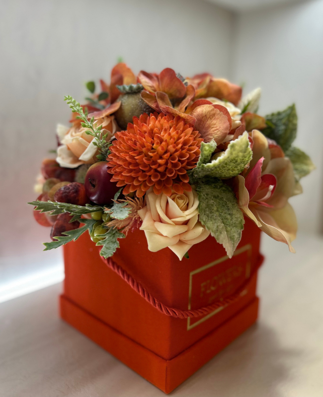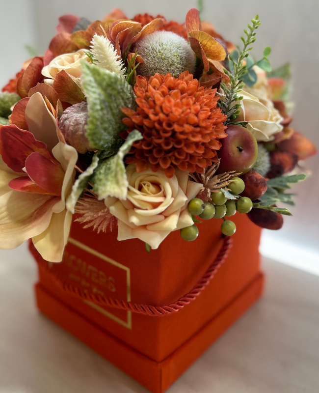 Présentée dans un écrin orange éclatant, Golden Amber est une composition florale faite à la main avec des fleurs soigneusement choisies. Une création unique qui reflète le savoir-faire artisanal et l’élégance intemporelle.