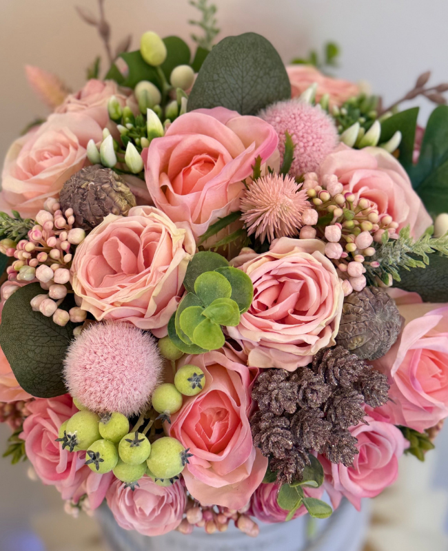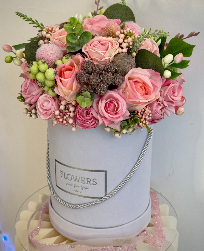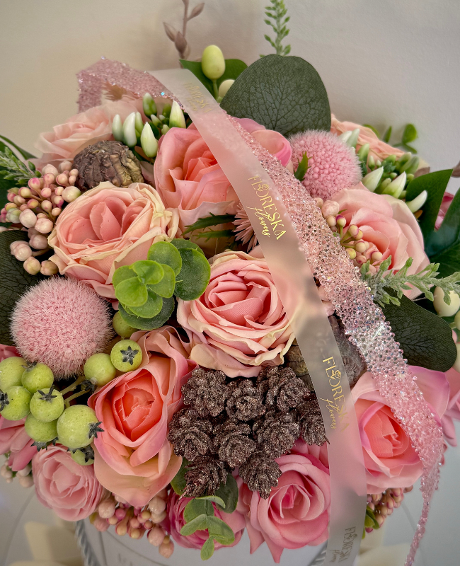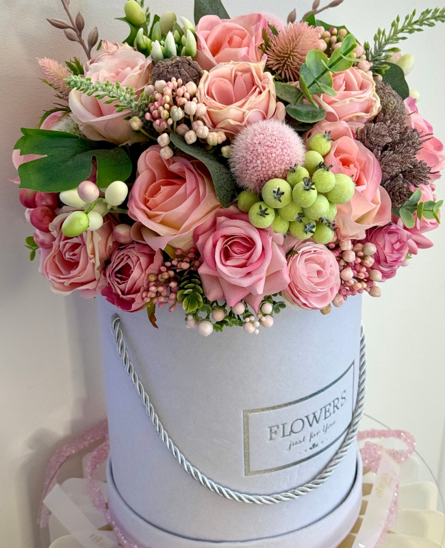 Petal Symphony révèle l’harmonie parfaite entre roses poudrées, baies délicates et feuillages raffinés, soigneusement assemblés pour créer une composition d’une élégance rare. Présentée dans un écrin velouté, cette création offre une allure sophistiquée et intemporelle.