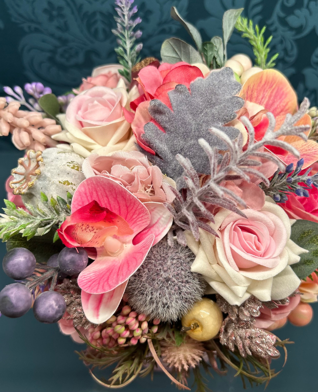 Cette composition florale associe des tons rosés, pêche et lavande dans une harmonie subtile, où chaque pétale semble caressé par la lumière. Les textures veloutées, les détails scintillants et les baies nacrées offrent un rendu sophistiqué, à la fois romantique et intemporel.